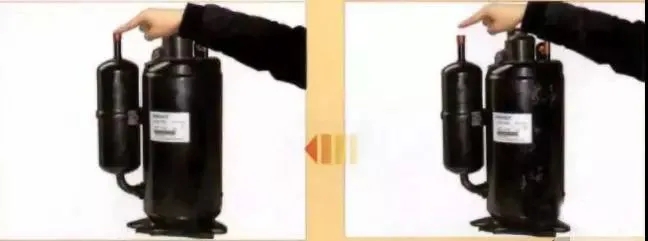 用手指按住吸氣管,若感覺到有吸氣壓力, 則表示壓縮機正常。當把手指移開時, 如果沒有感覺到任何吸力,說明壓縮機沒有吸氣能力。