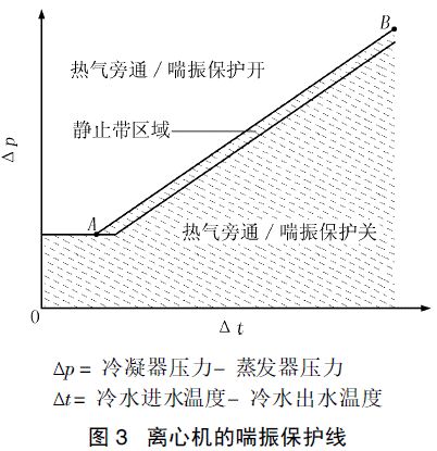 機(jī)組通過(guò)本機(jī)集總控制裝置(PIC)監(jiān)測(cè)壓縮機(jī)電機(jī)的電流來(lái)判斷機(jī)組是否進(jìn)入喘振工況。一旦機(jī)組電流的波動(dòng)幅度超過(guò)一定值(默認(rèn)是25%,也可以通過(guò)控制面板LID設(shè)定)達(dá)1s,控制系統(tǒng)就會(huì)記下一次喘振。如果在設(shè)定時(shí)間段內(nèi)( 默認(rèn)是5 min) 這樣的波動(dòng)達(dá)到12次,控制系統(tǒng)就認(rèn)為機(jī)組運(yùn)行進(jìn)入了喘振工況, 機(jī)組就會(huì)停止運(yùn)行并報(bào)警(EXCESSIV E COMPR SU RGE)。這樣就對(duì)機(jī)組進(jìn)行了保護(hù),防止喘振對(duì)機(jī)組的損壞。此外,還可以通過(guò)可選配件-熱氣旁通閥,當(dāng)機(jī)組將要進(jìn)入喘振工況時(shí)打開(kāi)熱氣旁通閥來(lái)改善機(jī)組的工況,達(dá)到對(duì)機(jī)組的喘振保護(hù)。