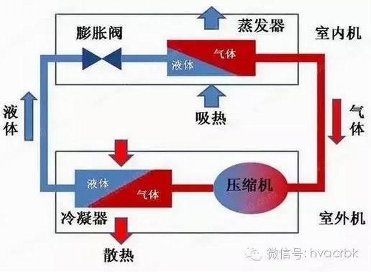 壓縮機將氣態(tài)的冷媒壓縮為高溫高壓的氣態(tài)冷媒,然后送到冷凝器(室外機)散熱后成為常溫高壓的液態(tài)冷媒,所以室外機吹出來的是熱風。然后到節(jié)裝裝置,進入蒸發(fā)器(室內機),由于冷媒從節(jié)流裝置到達蒸發(fā)器后空間突然增大,壓力減小,液態(tài)的冷媒就會汽化,變成氣態(tài)低溫的冷媒,從而吸收大量的熱量,蒸發(fā)器就會變冷,室內機的風扇將室內的空氣從蒸發(fā)器中吹過,所以室內機吹出來的就是冷風;空氣中的水蒸汽遇到冷的蒸發(fā)器后就會凝結成水滴,順著水管流出去,這就是空調會出水的原因。氣態(tài)的冷媒回到壓縮機繼續(xù)壓縮,繼續(xù)循環(huán)。
